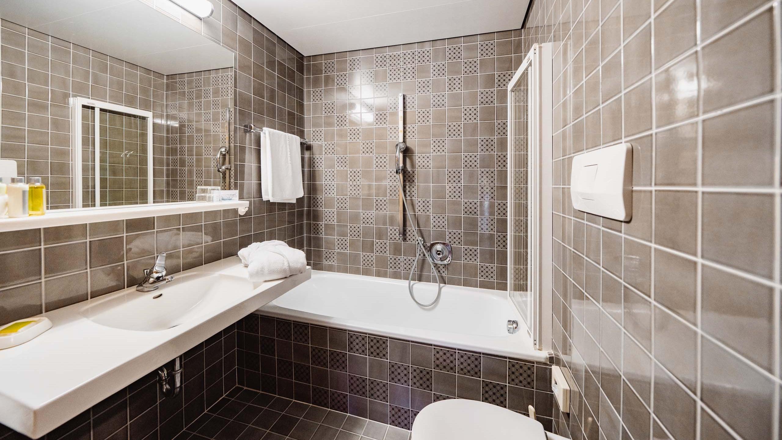 Gemütliches Komfortzimmer in der 2. Etage mit Balkon und Dolomitenblick, Flatscreen-SAT-TV mit Radioempfang, Telefon, Safe und WLAN. Das Badezimmer verfügt über Badewanne mit Dusche, Waschtisch mit großem Spiegel, WC und Bidet sowie flauschige Handtücher und Pflegeprodukte.